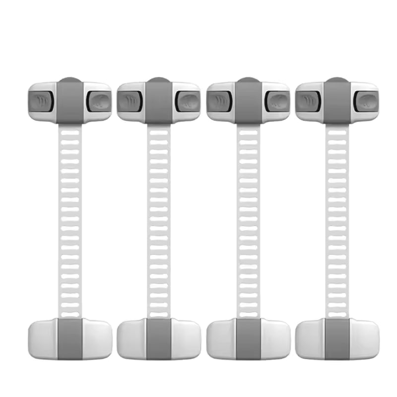 Each lock features a flexible, adjustable strap that fits a variety of surfaces and furniture shapes — from flat cabinets to corner drawers. Easy to install without tools, these locks use strong, damage-free adhesive for a secure hold and effortless removal when no longer needed.
